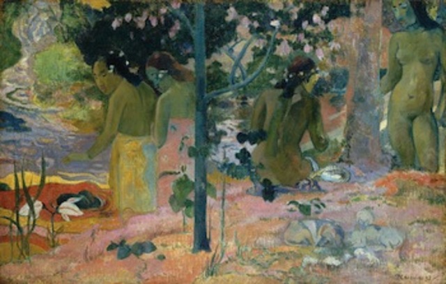 Image of Gauguin’s “The Bathers” courtesy of the National Gallery of Art.Flicking through a magazine last week, my eye alighted on an Oreo ad: “Milk’s Favorite Summer Dip” read the slogan near the top, while the image splashed cool blue and white across the page. There’s an up-close Oreo drifting in a mug of milk and two blue straws bending over the edge, looking just like the side-bars of a swimming pool step-ladder. It’s a clever image, designed to dip into the milk-dunking thing but also conjuring up cool connections with summer fun and snacking.