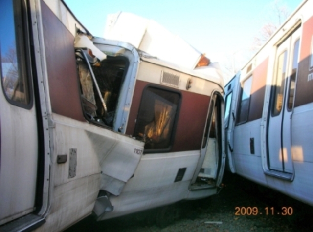 The crash destroyed three Metro rail cars, all series 1000, which are the oldest and least crash-durable in the agency’s fleet. The cars were placed in the middle of the six-car train as part of a safety move following the fatal June 22, 2009 Red Line crash. Despite the cars’ location in the center of the train, there was still significant structural damage and telescoping — where one rail car begins to climb over another.