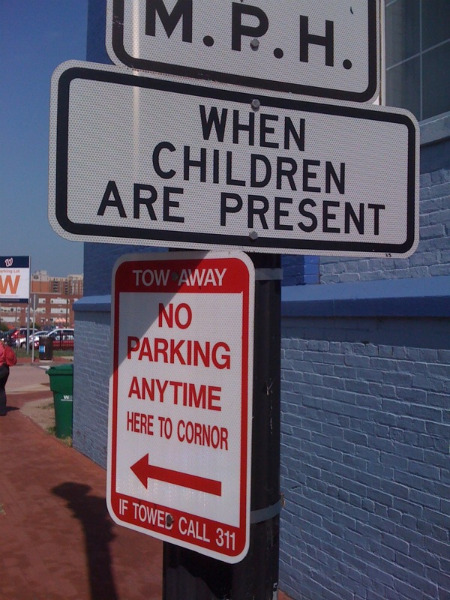 Speaking of locations near Nationals Park and DDOT, either this sign captured by Flickr user fedward at 7th and M Streets SE misspelled “corner,” or the amount of land that the transportation agency holds parking authority over just got a whole lot bigger.