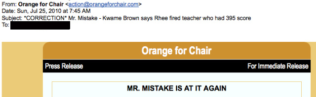 Vincent Orange, who is taking on Kwame Brown in the race to replace Vince Gray as D.C. Council Chairman, has adopted the strategy of calling Brown “Mr. Mistake” as part of his campaign, hopping on errors the current At-Large Councilmember makes whenever he can. True to form, the Orange camp (which is now tweeting!) sent out a press release on Saturday titled “Mr. Mistake Is At It Again,” accusing Brown of getting his facts wrong during that day’s Ward 7 Candidates’ Forum. Apparently, while he was discussing Friday’s DCPS firings and the IMPACT evaluations, Brown made the mistake of mixing up numbers. Nothing much to see here, really.