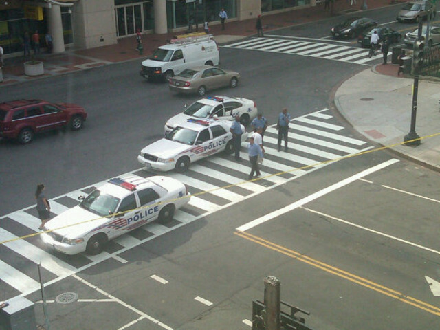 UPDATE (2:15 p.m): More details are now available regarding this morning’s incident at 7th and I Streets — police have taken a woman into custody after she stabbed another woman during a dispute outside the TD Bank at that intersection. NBCWashington.com notes that several witnesses assisted police in apprehending the attacker; the suspect was detained by construction workers until the police arrived on the scene. Officers who were just around the corner investigating the aforementioned suspicious package got to the scene quickly and took it from there. The woman who was stabbed, reportedly an intern at National Public Radio, is in stable condition and is talking to investigators at Howard University Hospital.
