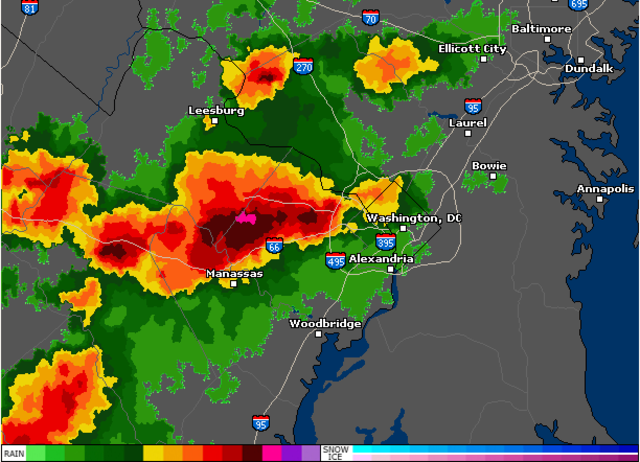 The scene outside the windows here at DCist headquarters has gotten mighty dark all of a sudden. A rather large thunderstorm is just starting to make its way across the District, seen above on radar about fifteen minutes ago. A severe thunderstorm warning and watch are currently in effect — here’s hoping you brought your umbrella.