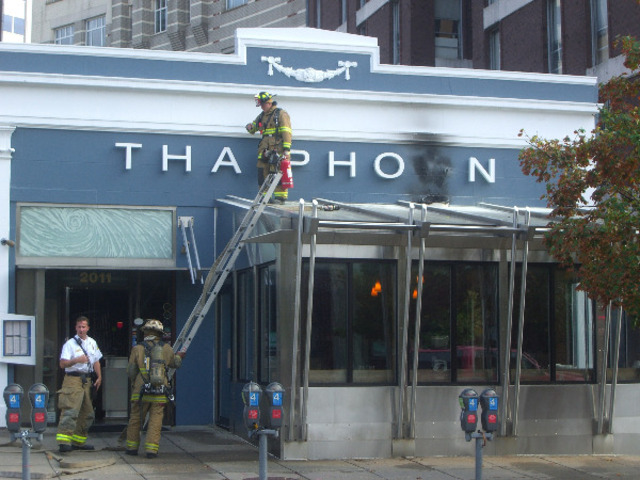 “Violent thunderstorms rolled into town this morning and as they rolled out, they nearly took a Thaiphoon with them. There was an incredible amount of lightning nearby and I wouldn’t at all be surprised if one of those bolts was responsible for the damage here at Thaiphoon. Shortly after the storms ended, I heard emergency vehicles pulling up in the neighborhood, looked out the window and saw Thaiphoon missing an “o” and on fire. The DCFD extinguished the flames before I got over there, but the storm’s mark was left…”