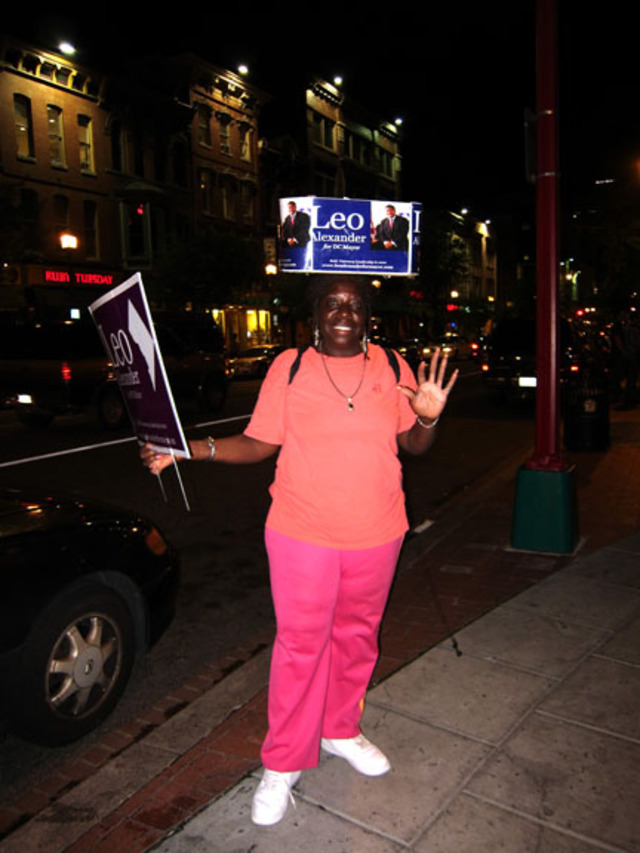 I was getting out of a movie at Gallery Place, standing on 7th Street with the fellas and debating the merits of Step Up 3-D when I noticed a woman campaigning for Leo Alexander. She was balancing a box on her head and lightly boogie-ing. I wondered, who else does that remind me of? I stared a little longer and started to recognize that face from almost twenty years ago. I tried to get her attention – she seemed lost in campaign thought – to ask if she was the RC Cola woman, and indeed she was! She had given up soda shilling and now runs her own hauling business. The new balancing act makes perfect sense: if Fenty were Coke and Gray were Pepsi, then, sure, Alexander can be RC Cola.