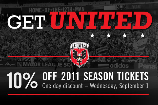 For the first time in club history, D.C. United is offering a discount on season tickets. For one day only, you can get 10% off on 2011 Season Tickets. The discount happens on Wednesday, Sept. 1 so don’t miss out on your chance to Get United!