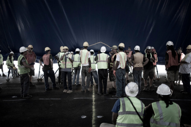 Surely, you’ve seen the advertisements — Cirque du Soleil is coming to Maryland early this month for a limited engagement at the Plateau at National Harbor. Yesterday, the Cirque finished raising the massive enclosure which will house the performance. The Grand Chapiteau, as it’s known, is 66 feet high and is 167 feet in diameter. Each mast of the structure is 80 feet tall, and 550 pegs hold the Chapiteau to 4,500 square metres of asphalt. The tent — though it’s really not fair to call it simply a tent — can hold 2,600 people. DCist staff photographer Kevin Carroll was on the scene to document the big top’s ascension.