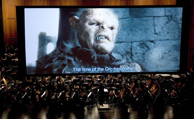 The latest spin-off from Peter Jackson’s Lord of the Rings trilogy returned to the Filene Center at Wolf Trap last night. You may have already shelled out for the DVD boxsets, both the theatrical release and the extended versions, and role-played with dwarfs in the online game, but true LOTR fans surely will be happy to pay even more for the experience of watching the movie on a giant screen with a live orchestra. Howard Shore, LOTR score composer, has recently made a six-movement symphonic version of his internationally-performed and Academy Award-winning scores. For the past few years, conductor Ludwig Wicki has been leading orchestras in live (amplified) performances of Shore’s music during screenings of the films in mega-venues like Radio City Music Hall. Wolf Trap has already presented the first two films in this way, Fellowship of the Ring in 2008 and The Two Towers in 2009. Finally, the Filene Center hosted the U.S. premiere of this version of the final film last night; an evening of pleasantly cool air, no rain and plenty of amped-up Tolkien nuts.