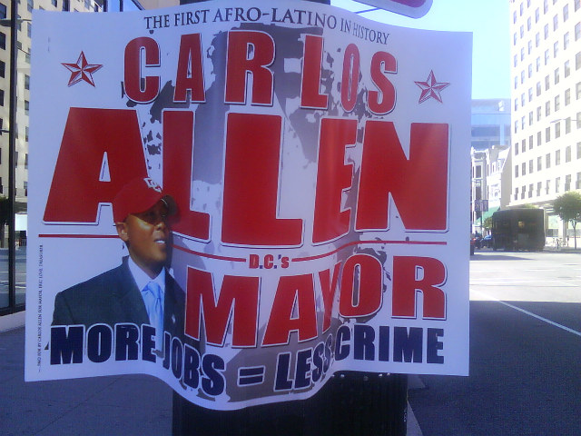 Carlos Allen, noted (alleged) White House party crasher and former party promoter, is still running for Mayor. Allen will appear on the ballot for the November general election as an independent candidate and signs for his campaign have started popping up on lightpoles around town. Allen’s taking a very interesting angle in this campaign signage: he boasts that he is “The First Afro-Latino in History.”