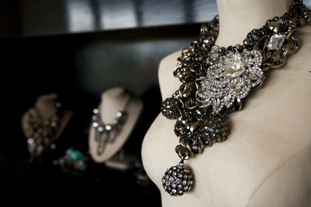 There are three labels under the Couture Saboteur brand. The tagging, pricing, as well as style and size of the necklaces denotes the nuances between the lines. Couture Saboteur is the original concept. Contraband is a smaller, younger vibe at a more affordable price point. And Vows, which is very new, is a line of more opulent bridal pieces that are larger in scale and very labor intensive. The look is mostly pearl driven, which coincidentally is a huge call out for fall/winter ’10, and integrates materials that are unconventional to the bridal category. The goth and hipster brides are out there and they’re looking for unusual pieces!
