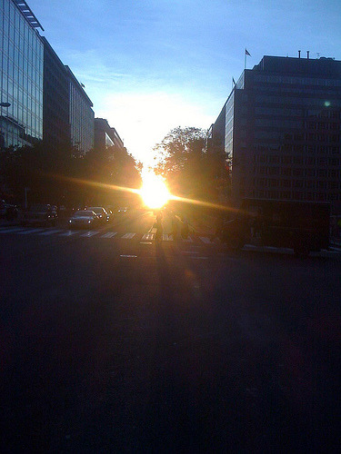 D.C. and New York City experience this phenomena on different days, since Manhattan’s perpendicular grid of streets is tiled about 30 degrees off-axis, while ours lines up directly north-south and east-west. As deGrasse Tyson notes, the sun sets directly west twice a year, on the equinoxes. That makes it pretty easy for us to remember when our modest D.C. Henge occurs: Wednesday is the autumnal equinox. Since the sun moves only a smidge in the sky each day, we’ll actually be able to see it setting down our alphabet streets most of the week, but tomorrow will be the day to bring your camera and catch it between, you know, the awe-inspiring lobbies of a couple of ten-story law firms.