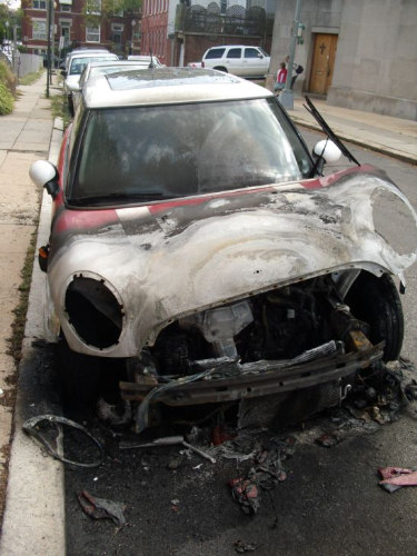 DCist contributor Andrew Wiseman unearthed an interesting story over at his New Columbia Heights blog yesterday: there’s been a rash of car fires in the neighborhood of late — but according to one person whose brand-new Mini Cooper caught on fire (see right), the fire department is categorizing most of the blazes as “mechanical” fires, rather than arson. An excerpt from the email that Mimi, the owner of the Mini, sent in: