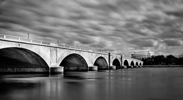 I love it when a photo in our pool shows off just how photogenic this town is, includes a well known monument, and still manages not to be cliché. This long exposure by sosico from the Virginia side of the Memorial Bridge looking toward the Lincoln Memorial blurs the moving water and clouds, making the bridge pop out.