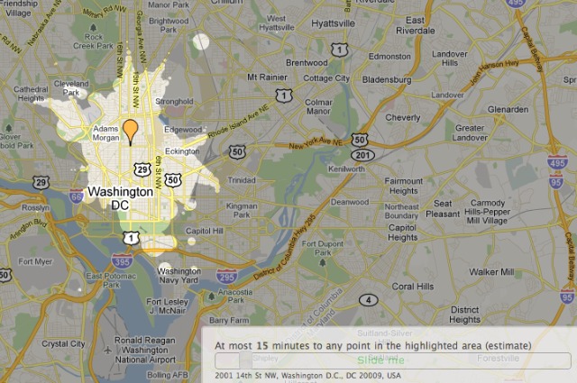 Have you ever spent time wandering aimlessly around the District, wondering about the various places you could get to within, say, 15 minutes? Well, here’s something that your DCist editor has been toying around with this afternoon that should come in handy for when you find yourself in such a scenario: Mapnificent is an incredibly fun-to-play-with, dynamic tool which allows you to drop a pin anywhere on a map of D.C., specify how much time you have to spend on transit and then poof — the map will then highlight where you can get in that amount of time, using schedules from WMATA and your answers to questions like whether or not you have a bike and how quickly you can or want to walk between Metro stations. There is an easy-to-switch-on option for night time schedules, as well. (A big hat tip to resident DCist tech guru Tom Lee for the info on this particular timesuck.)