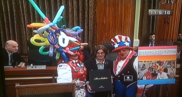 About a half an hour ago, the Council honored Judy and Gary Kopff, a couple who moonlight as clowns and entertain wounded soldiers at Walter Reed Medical Center, among other places. Clown Gary, who joked that they are “clowns at-large,” certainly do some very good work ( you can read all about the laughs they offer vets in this Washington Times profile), and Judy and Gary shared some emotional words, focusing on how they flipped the negative news that they were unable to have children into a positive by deciding to help soldiers at Walter Reed.