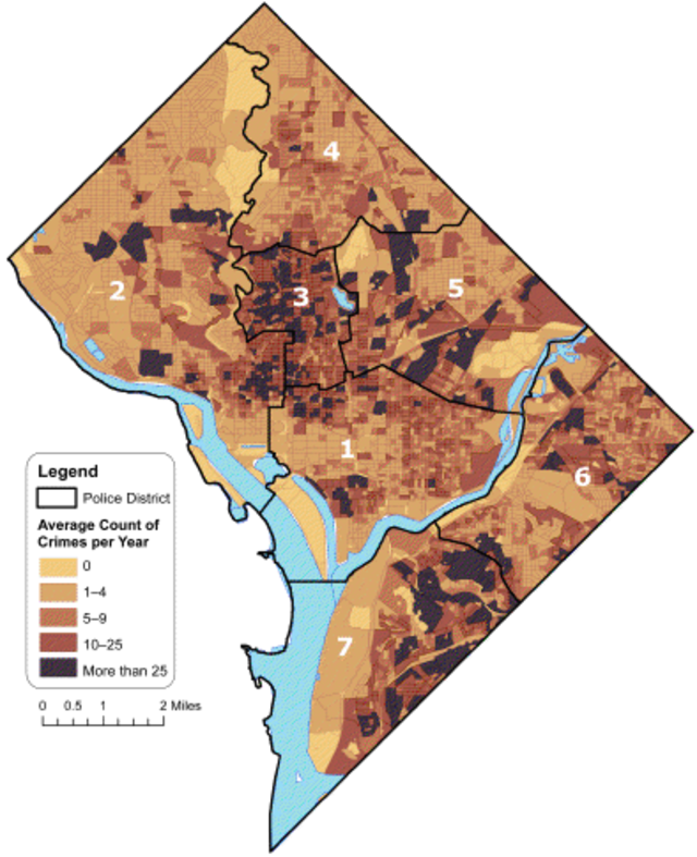 On the bright side, the brief also notes that, on average, nearly a quarter of all D.C. census blocks have experienced no crime over the last decade while a majority have experienced four or fewer crimes per year.