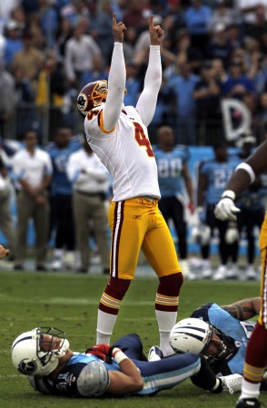 Graham Gano, victorious. (AP Photo/Mark Humphrey)So how do you like Donovan McNabb and his (reasonably) fat contract now? The Redskins prized quarterback threw for 376 yards and a touchdown in a 19-16 overtime barn-burner merciless-torture-on-the-eyes victory over the Tennessee Titans. In case you’re doing the math: yes, McNabb put up nearly 400 yards in a game that had only one offensive touchdown (the Titans scored their touchdown on a punt return that featured a blatant block in the back). The game wasn’t ugly by conventional standards. Both teams moved the ball, minimized the number of three-and-out series and made big plays in all facets of the game. But scoring opportunities in opponent territory featured both a lack of execution and some laughable play-calling.