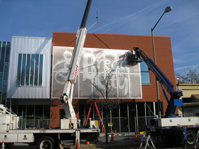 A new sign is hoisted onto Bread for the City’s expanded headquarters.If you happened across Bread for the City‘s headquarters on Seventh and Q Streets NW yesterday, you likely witnessed a crane hoisting a big, shiny sign onto a new building.