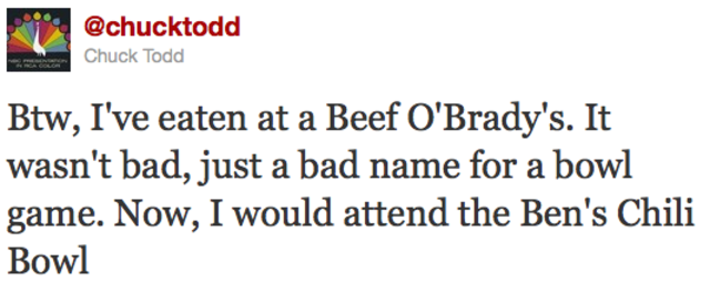 Well, wouldn’t you too? For those looking for context: NBC Chief White House Correspondent Chuck Todd is kidding about the Beef O’Brady’s Bowl, named after the semi-national chain of sports bars which serves as the sponsor of St. Petersburg, Florida’s annual postseason college football game. The odds on the folks over at the D.C. Sports and Entertainment Commission (who, this year, renamed Washington’s bowl game “The Military Bowl presented by Northrop Grumman”) having made this joke a million times around the office have to be pretty good, right?