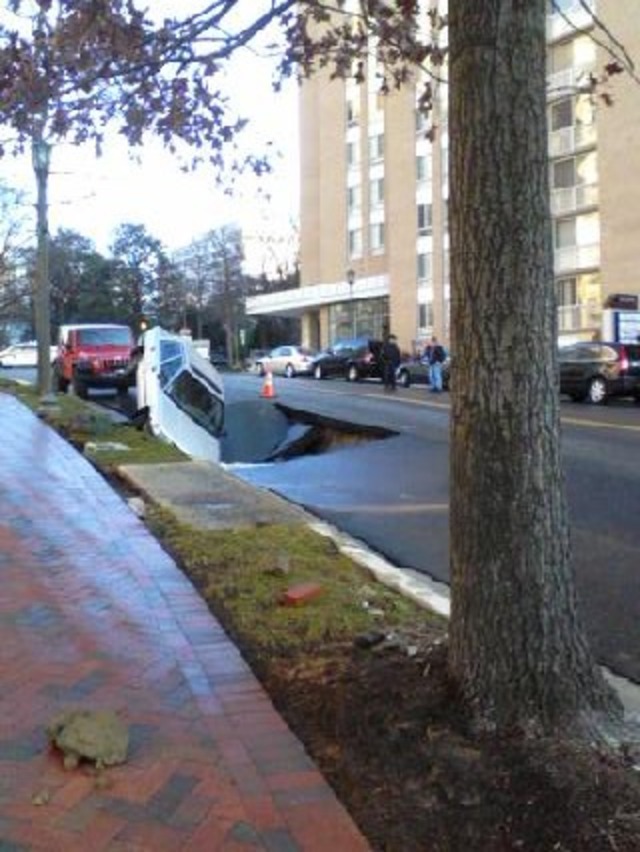 DCist food editor Jamie Liu sends in these photos from the scene of an early-morning water main break which happened just across the District line near the intersection of Friendship Boulevard and Willard Avenue in Friendship Village. A vehicle, parked on the curb of Friendship Avenue, fell into a hole created by the main break, which occurred around 6 a.m. It is not yet clear who has jurisdiction over the broken main, but the Washington Suburban Sanitary Commission is reportedly working on turning off the water.