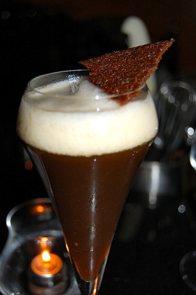 The Ginger Snap is a great combination of these elements. Featuring a base of rye whiskey, Domaine de Canton and Guinness scorched ginger and molasses syrup, the drink is topped with a heated, sweet, spice-infused foam made with xanthan gum and garnished with a thin toffee-like shard of ginger snap. The foam provides the ginger snap-like fragrance as you bring the drink to your mouth. There’s something pleasing about how, at first hit, the foam warms your mouth before getting to the cool rye, and how the two elements combine to create a liquid ginger snap. And as you make your way through the drink, it has an even balance of bitter and sweet, rather than becoming increasingly cloying as you might expect.