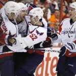 Yesterday, four members of the Washington Capitals — forwards Nicklas Backstrom and Marcus Johansson, and defensemen Karl Alzner and John Carlson — took a break from their usual weekend routine to get back to basics on the National Mall. The four traveled from the team’s Kettler Capitals Iceplex practice facility to the National Gallery of Art Sculpture Garden Ice Rink to take part in the pond’s Community Day festivities — the four took a few spins around the rink with about 200 people. DCist staff photographer Kevin Carroll tagged along with the Caps as they laced up, donned the sweaters and hit the ice.