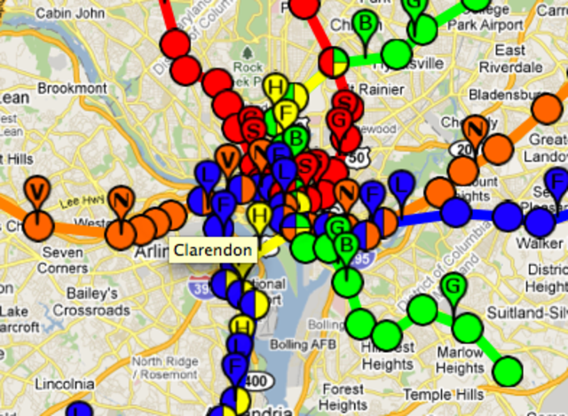 The application, created and hosted by The Unofficial D.C. Transit Guide, uses WMATA’s developer API to pull data (the same that you see on Metrorail station public information displays) and crunches the numbers to come up with an approximate location. You can determine the direction the trains are going by looking at the letter on each train’s pin — the terminus the train is heading to is represented by the first letter of its name, like “V” for a Vienna-bound Orange Line train.