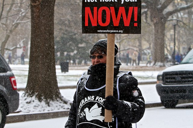 It was her first time in cuffs (or thick plastic ties, anyway), newly retired and no longer encumbered with a military security clearance to keep up. Deborah, an Air Force veteran and former radar operator, has helped run her local Veterans For Peace activist group in Southern California since 2005, the same national group that organized yesterday’s non-violent civil disobedience to protest the Iraq and Afghanistan wars.