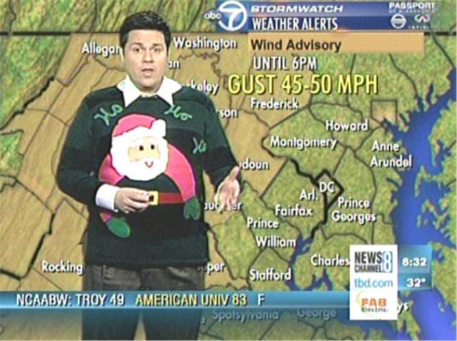Photo courtesy TBD News.You might think that you’ve got holiday spirit. But are you willing to go on television during the morning rush like ABC7 weatherman Brian van de Graaff while donning an ugly sweater, apparently this year’s holiday trend du jour? I doubt it. Full credit to you, Mr. van de Graaff — your dedication to holiday merriment through iron-on decals is beyond reproach.