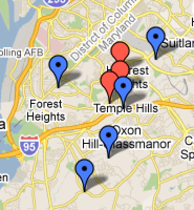 The Post was kind enough to put together the above Google map which indicates the location of each of the homicides (blue pins) and related injuries (red pins) during the spree. No arrests have been made in any of the homicide cases so far; in 2010, Prince George’s County recorded 98 homicides.