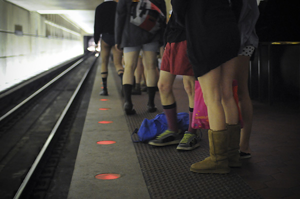 The event, adapted from the New York-originated tradition, first hit D.C. in 2008, and has grown in participants each year. This Sunday’s event currently has a whopping 876 people planning to attend. Organizers from Capitol Improv are telling those interested in blanketing the subterranean with pantsless people to meet in Hancock Park — note: people must wear pants to the meeting spot — bordered by C and 7th Streets SW. From there, the group will de-pant as a group and take to L’Enfant Plaza.