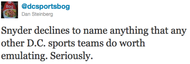Most of the Post’s sports staff and a some of the paper’s business reporters are attended the conference and tweeted up a storm, but Dan Steinberg’s above relay from the proceedings pretty much says everything you need to know about why everyone really dislikes Snyder and thinks he’s a cancer on the once-proud Redskins franchise.