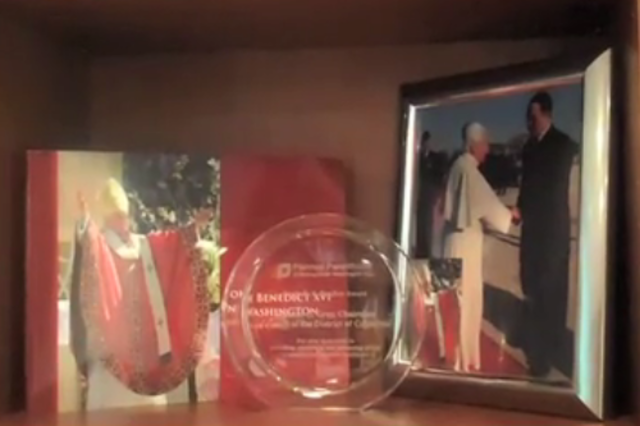 The highlight of the clubby, comfortable office? Check out the new Mayor’s library shelf in photos 5 and 6 of the Post’s photo gallery. On one of the shelves, you’ll see an album from Pope Benedict XVI’s visit to Washington, a picture of the Pope shaking hands with the then-Council Chair and, in front of those, an engraved glass plate. That plate? It’s an award from reproductive rights organization Planned Parenthood. The full text of the engraving is hard to make out, though it appears to be an award for “dedication to providing, promoting, and protecting quality reproductive healthcare,” or something along those lines.