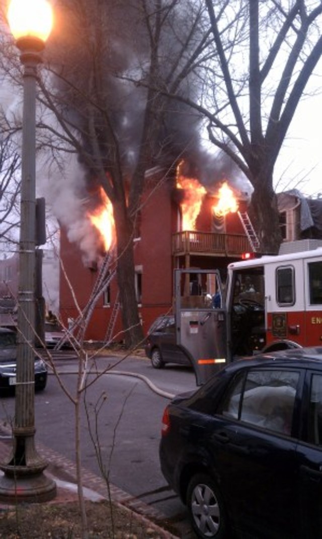 This afternoon, D.C. Fire and EMS responded to the scene of a raging house fire inside a two-story rowhouse at 1923 2nd Street NW. The fire was so large that it apparently spread to a neighboring building. Smoke from the blaze could also be seen from as far as dozens of blocks in either direction. The fire has reportedly been mostly put out, but there have been several injuries reported.