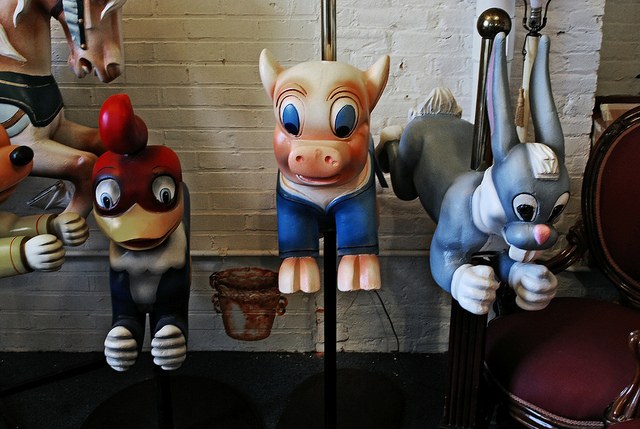 Our lawyers tell us that we can’t refer to these antique carousel poles by their more common names, so instead let’s call them Dorky Pig, Hugs Bunny and Goody Woodpecker. Nevertheless, how often can you reclaim a piece of your childhood and take it back home in the car trunk? On a recent trip, Marcellina found these nostalgic, albeit a tad creepy, carousel mounts. Screw IKEA, can you say new dining room seats?