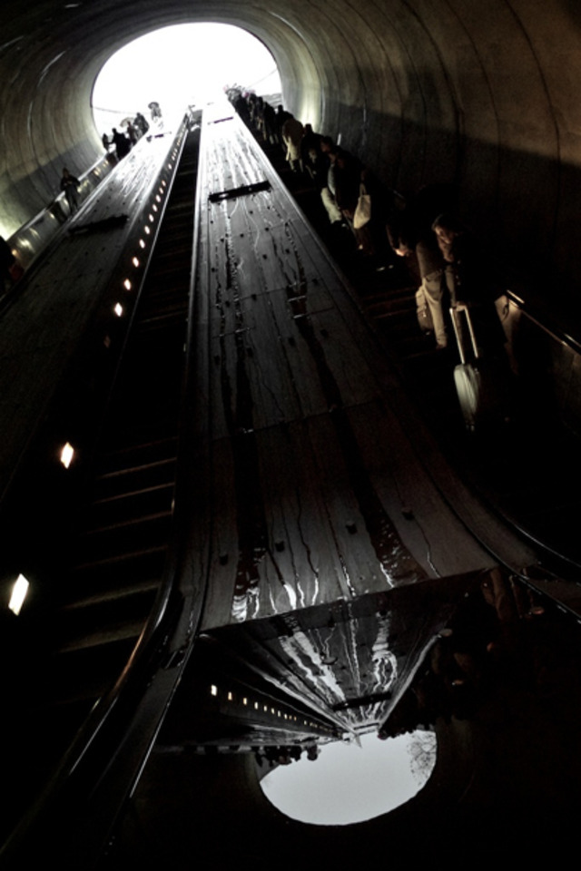The journey to the top of the Dupont Circle Metro station is a long one, especially when heavy, wet snow awaits at the finish. Rpmaxwell spotted this cool reflection in a puddle of chilly water. That can’t be good for the escalators, can it? (EXIF.)