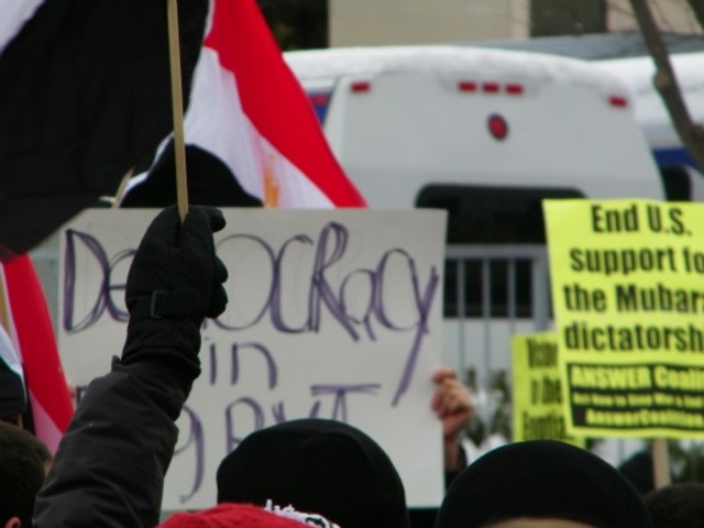 This afternoon, about 200 to 300 people gathered at the Egyptian Embassy in the Van Ness neighborhood of NW to call for Egyptian President Hosni Mubarak’s resignation, as well as to show solidarity with those protesting in Egypt. Chanting in Arabic and English, the crowd called for freedom for Egypt. Surrounded by the media as is usual in protests, the crowd passionately called for Mubarak to step down. As word came down that there had been damage to the Egyptian National Museum in Cairo, the crowd stopped for a moment, in a sober silence. The protest later marched down Connecticut Avenue headed towards the White House, with a police escort. Meanwhile, protests continue in Egypt.