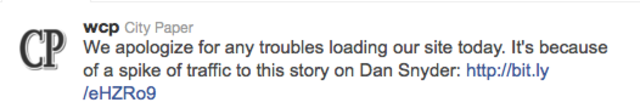 The story about Snyder’s potential legal maneuvers against the paper been picked up — and linked to — by all sorts of national outlets, from Gawker to NBC. This in turn has driven massive amounts of visitors aching to read to McKenna’s piece, as tweets from City Paper staffers and the paper’s own account attest. It goes without saying that this attempt by Snyder to cover up information which a) everyone in Washington already knows, and b) has been floating around for nearly three months, could net little more than some beefier traffic figures for the City Paper. That, and plenty of jokes about the utter ridiculousness of the whole situation.