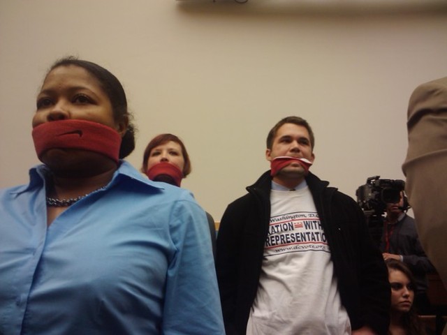 According to DC Vote, which organized the protest, some 14 voting rights advocates were detained after they stood up during the hearing with gags on their mouths. The gags represented the fact that no D.C. residents were allowed to testify on the measure — even D.C. Del. Eleanor Holmes Norton was prevented from speaking at the hearing.
