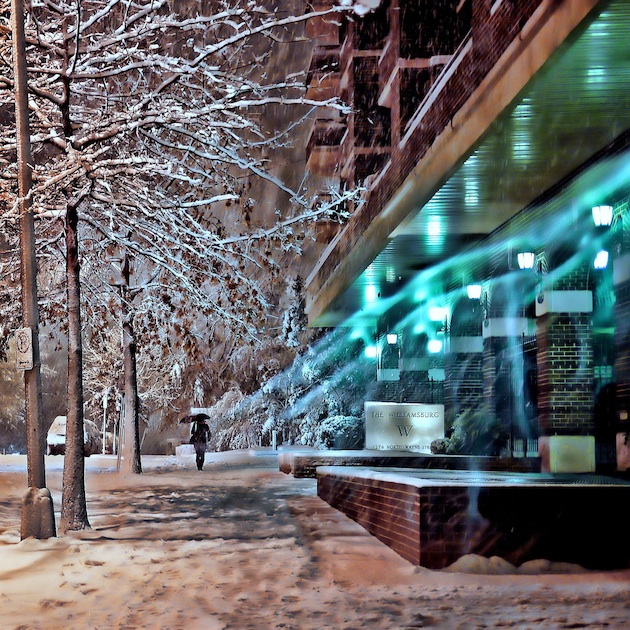 This ghostly image, perhaps brought on by the lights hitting snow on the lens, reminds me of the scene around this town a year ago. Sadly, it’s from this year, in which snow has all but shunned us. Karon manages to grab the stereotypical snow shot, adding some intrigue (or ghosts) from the lights. (EXIF.)