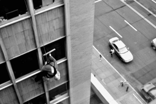 We are used to looking up at window washers, but Flickr user PlantainsandKimchi found an interesting perspective on an everyday scene. There are lots of great elements to this photo, including the angle, the lines, and the person on the street. A tilt-shift lens can be an overused gimmick, but it really works in this image. (EXIF.)