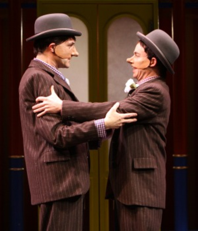 Speaking of masks, each character wears one. Aaron Cromie handled mask and puppet design, and the masks have an creepy, melty, realistic look to them. One might think the extra layer of deceit would further confuse the issue in a play about mistaken identity, but the disguises have an added bonus: the fact that two actors who look nothing alike can play twins a little more convincingly. The Comedy of Errors, for the unfamiliar, involves two sets of twins: brothers separated at birth, along with their loyal servants. In a bit of fuzzy logic, both sets of twins each have the same name (because you know, why wouldn’t they?), adding an additional layer of confusion as wives, policemen, barmaids and even the occasional nun proceeds with no idea they’re dealing with anyone beyond who they expect, even as the behavior of their presumed husbands/acquaintances/debtors gets more and more inexplicable.