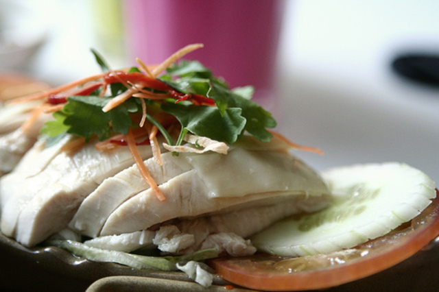 The first dish I usually make from my chicken is similar to Cantonese white cut chicken. It’s typically a straightforward poached chicken on rice, served with a ginger-scallion-garlic dipping sauce. Simply heat two stalks of chopped scallions, three cloves of minced garlic, a few coins of ginger and a teaspoonful of salt with a few tablespoons of sesame and olive oil. It’s a wonderfully fragrant and flavorful sauce that also goes well with meaty white fish like tilapia or leafy green vegetables.