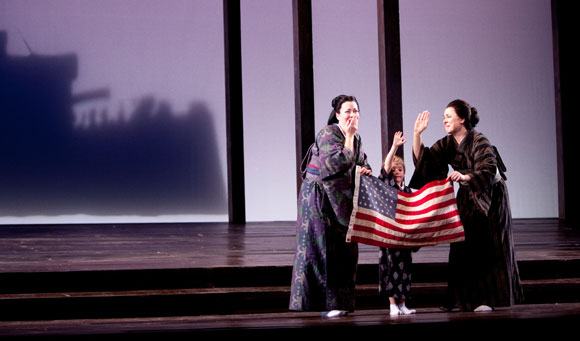 Cio-Cio-San (Catherine Naglestad), her son Trouble (Oliver Anderson), and Suzuki (Margaret Thompson), in Madama Butterfly, Washington National Opera. Photo by Scott Suchman.