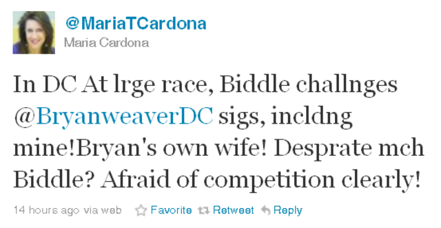 Cardona’s inclusion on Biddle’s suggested list of signatures that the D.C. Board of Elections and Ethics should throw out — which would effectively knock Weaver and fellow candidates Jacque Patterson and Patrick Mara off the ballot — is but one of a number of notable D.C. voters that Biddle’s campaign is accusing of not being registered voters, filling out the wrong address or otherwise messing up when they signed nominating petitions.