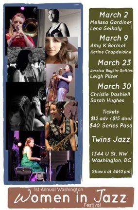 >> As we said yesterday in our interview with pianist Amy K. Bormet, the inaugural Washington Women in Jazz Festival launches tonight at Twins Jazz with vocalist Lena Seikaly and trombonist Melissa Gardiner. 8 p.m. Tickets are $12 in advance / $15 at the door + $10 food/drink minimum.