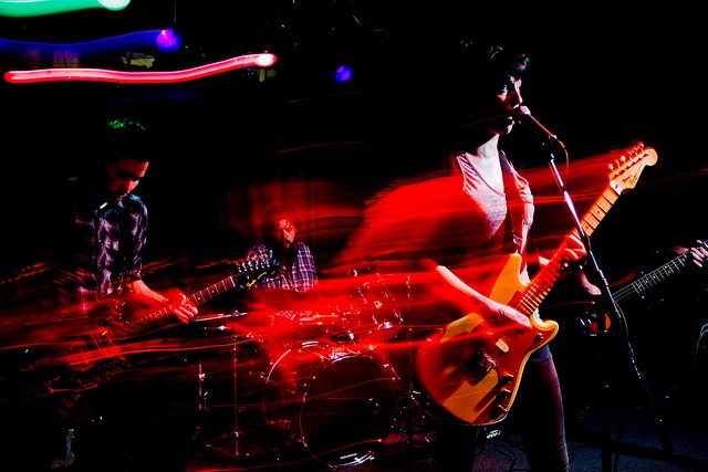 Sometimes the action at a concert can be fast and frenetic, a challenge for a concert photographer. Capturing that iconic angst-ridden expression of the lead singer, or freezing the muscle tensing gyrations of a guitarist with a fast shutter under sparse lighting is a maddening endeavor. In this case, csuspect chose to use multiple lighting sources and long shutter speed to imbue movement into this shot of Thee Lexington Arrows at the Velvet Lounge.