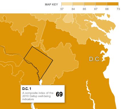 I’ve been spending some time this morning playing with this infographic, released by the New York Times over the weekend, which shows the results of a Gallup poll in which 1,000 randomly selected American adults were called every day over the last three years, and asked questions like “Did you learn or do something interesting yesterday?” and “Is the city or area where you live getting better as a place to live?” Gallup then plugged those responses into an index called the Gallup-Healthways Well-Being Index — it’s a pretty fun way to kill a few minutes. So how does D.C. stack up?