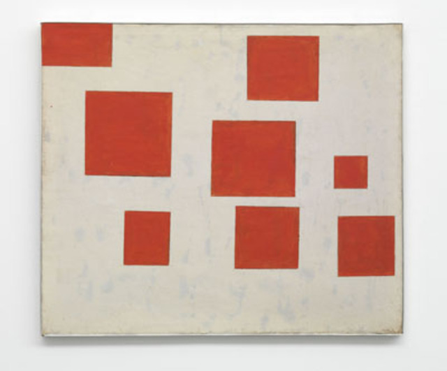 Blinky Palermo, Komposition mit 8 roten Rechtecken [Composition with 8 Red Rectangles], 1964. Oil paint and graphite on canvas. 37 3/4 x 43 3/4 in. (96 x 111 cm). Collection Olga Lina and Stella Liza Knoebel. © 2010 Artists Rights Society (ARS), New York/VG Bild-Kunst, Bonn. Photo: Jens ZieheWhat do a notorious Philadelphia Mafioso and a student of Joseph Beuys at the Dusseldorf Art Academy have in common? A name – and careers that were colorful in markedly different ways. Peter Heisterkamp, besotted by American culture, took the name of boxing manager/racketeer Frank “Blinky” Palermo as his own and forged a brief but influential career that was but a blip in the life of his namesake. Blinky Palermo, the man behind Jake LaMotta and Sonny Liston, died in 2006 at the ripe old age of 91. Blinky Palermo, the artist, died in 1977 at the age of 34. Who says boxing is more dangerous than art?