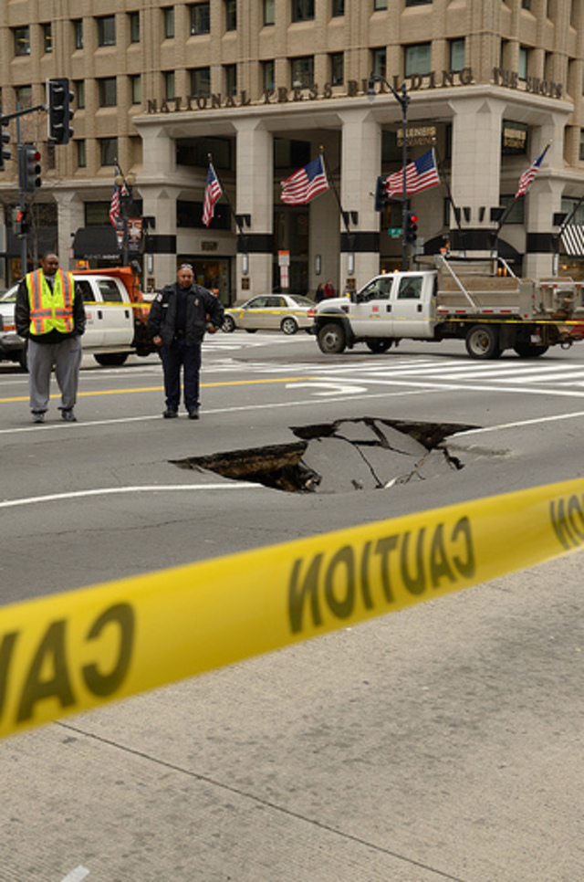 Photo by Don Baxter/TriVerge Media.On Saturday, a portion of 14th Street NW between F and G Streets collapsed due to a water main break, closing the road to traffic for a short portion of time. DDOT said that they’d need to make more permanent repairs over the next few days — and one look at the size of the hole explains why those more extensive repairs are necessary. (Luckily, your run-of-the-mill pothole can usually be patched up much faster.)