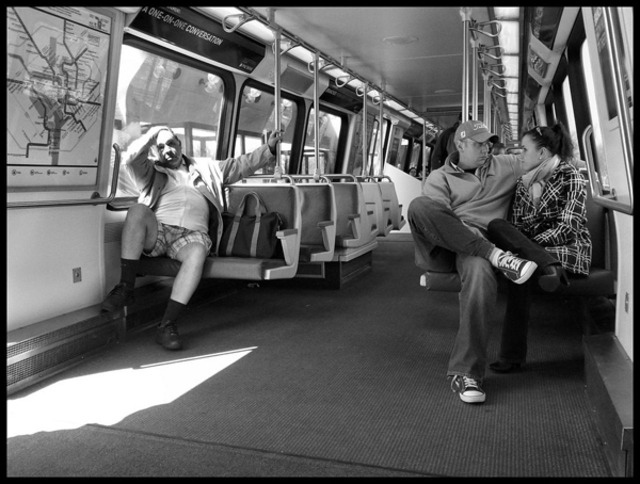 B Jones Jr captures an ordinary, everyday scene while riding public transportation, right? Wrong. This image illustrates the moment a guy realizes that he’s taking part in the No Pants Metro Ride on the wrong day. (EXIF.)